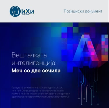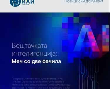 Вештачката интелигенција е трансформативна сила што носи огромен потенцијал за Северна Македонија, но истовремено значи и ризици или предизвици. Овој документ ја истражува деликатната рамнотежа помеѓу иновациите водени од ВИ и социо-економските нарушувања што тие можат да ги предизвикаат, истакнувајќи некои клучни позиции што опшетството може да ги заземе особено во услови на регулаторни празнини. Проценката на овие ризици е исклучително важнa па оттаму документот илустрира и клучни активности на И-Хи, Тинк Тенк, Скопје, за хумана имплементација на ВИ.
